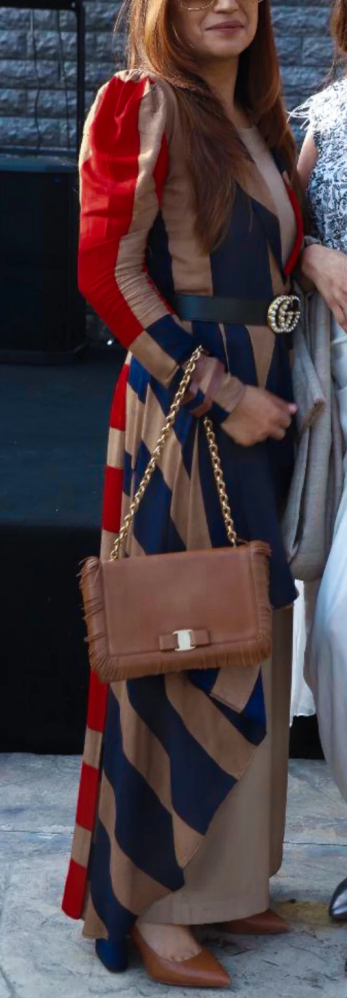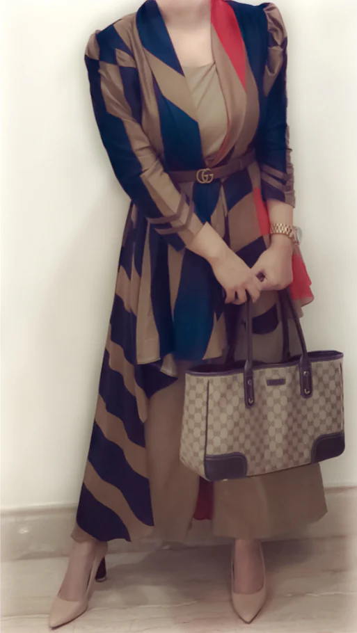 Triad of stripes (brown / red / blue) in high low tapered jacket (35″short – 53″long) colours can fall anywhere with brown jumpsuit (55″)