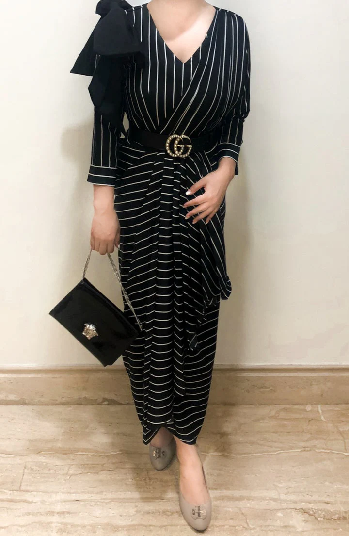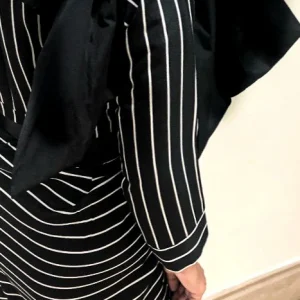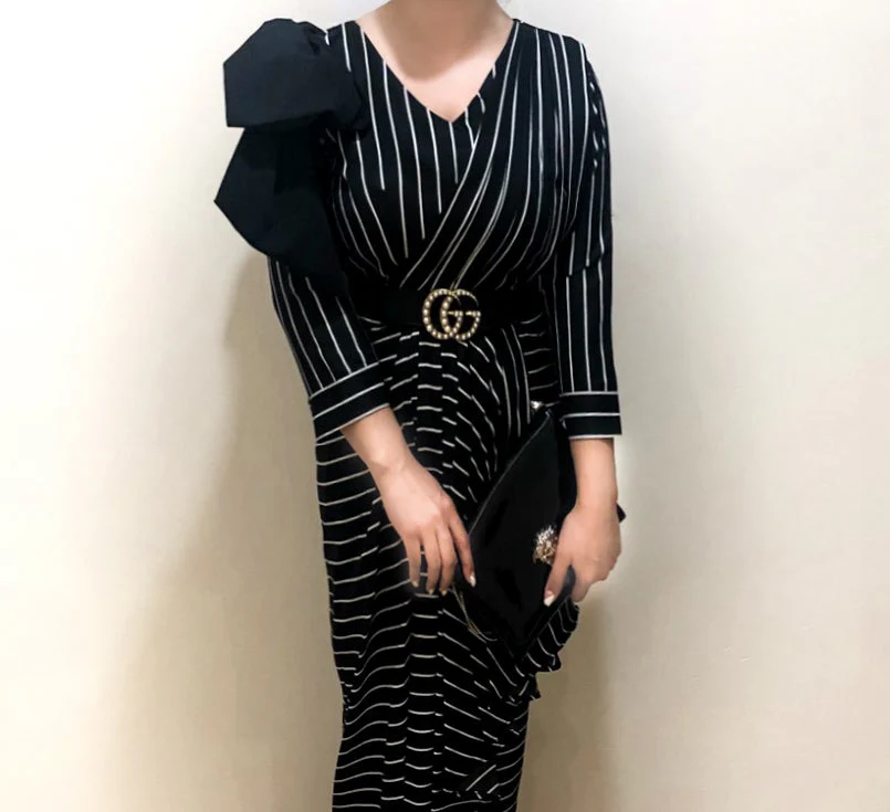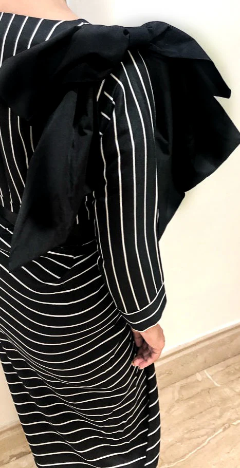 Monochrome Stripes maxi (55″) with bow on shoulder.
