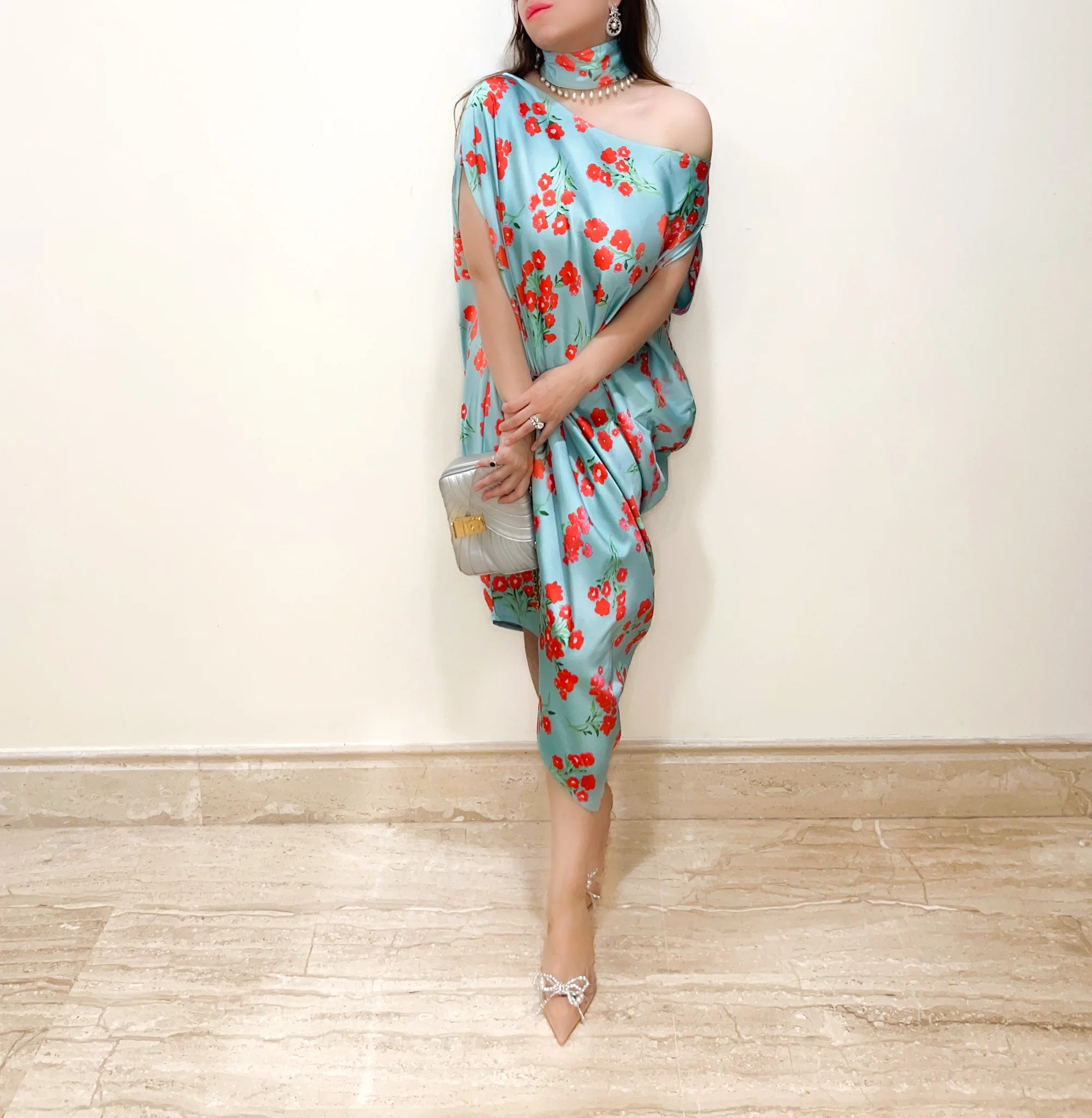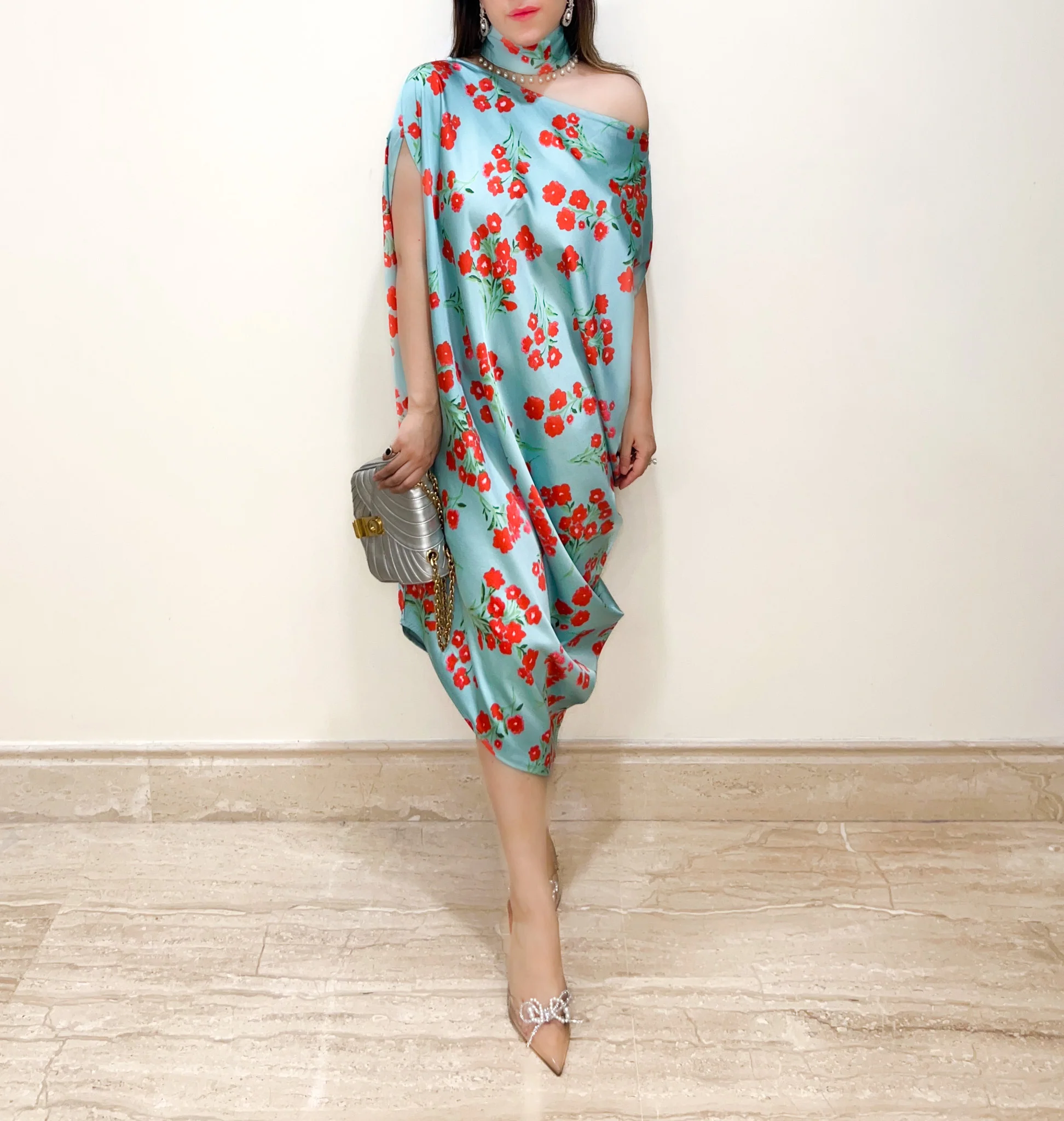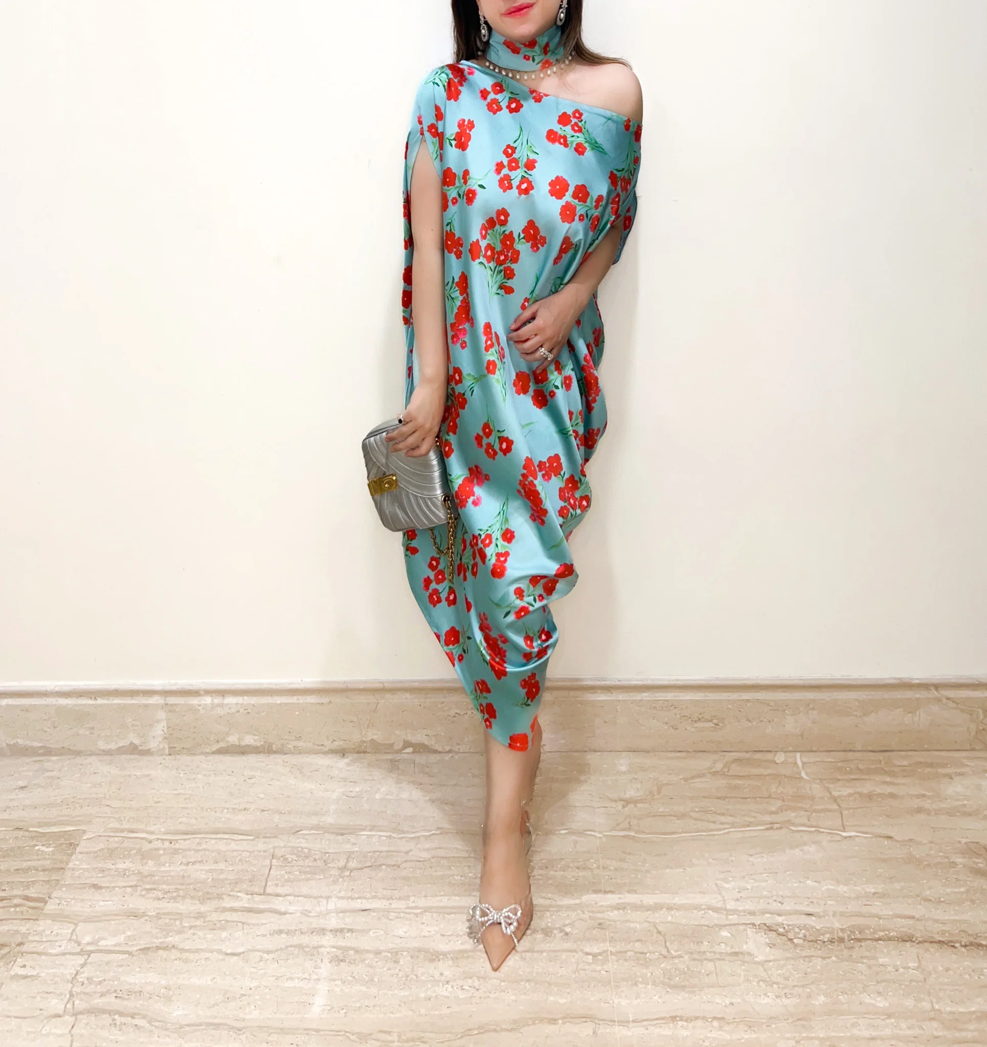 Poppy print asymmetric drape dress (44″) with neck tie.