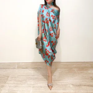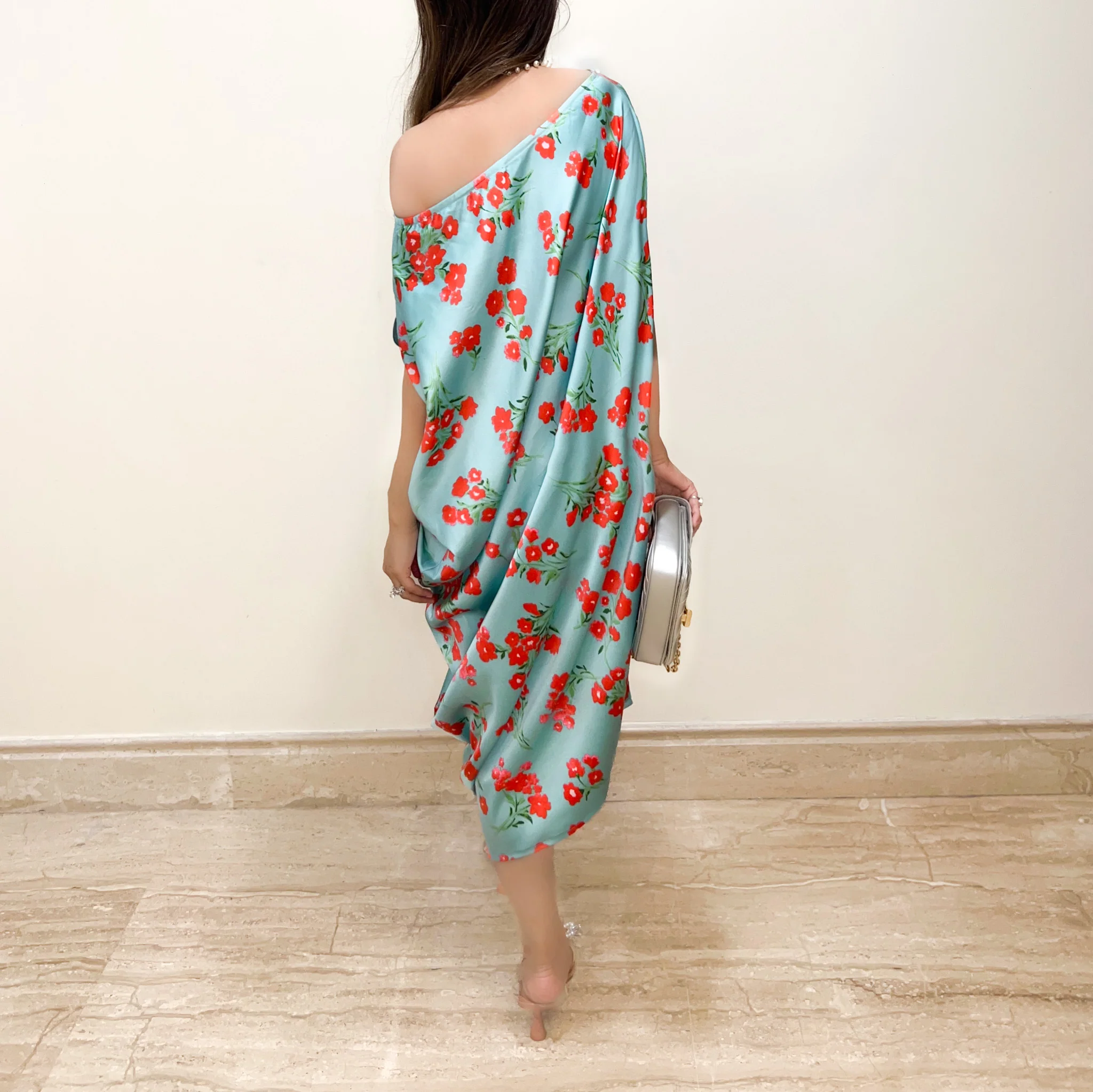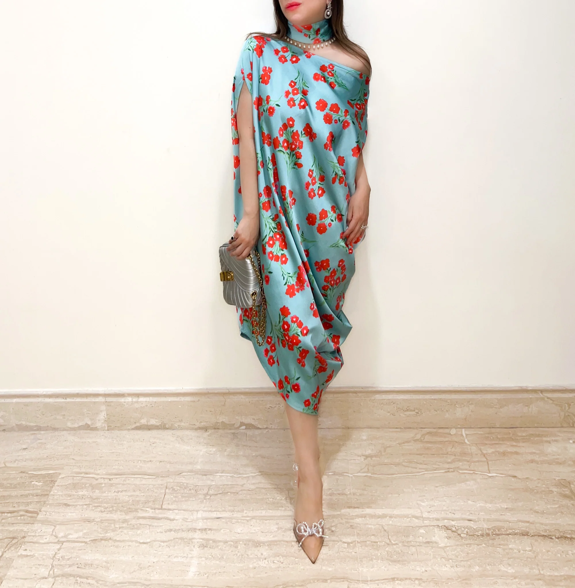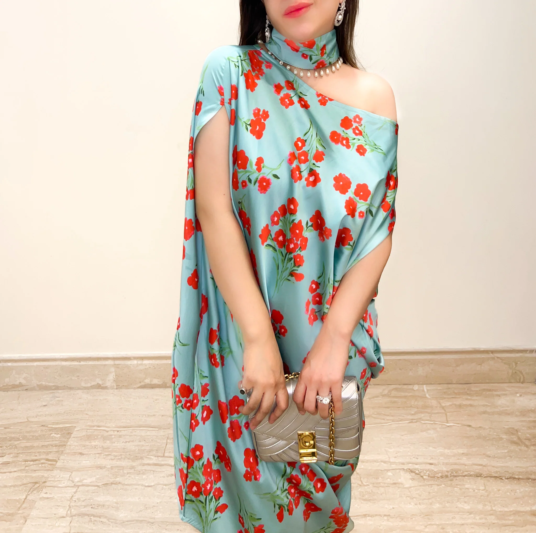 Poppy print asymmetric drape dress (44″) with neck tie.