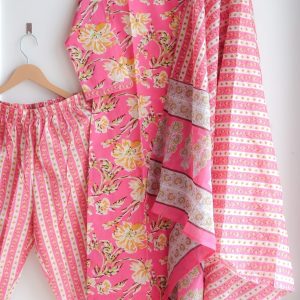 Introducing our vibrant Three-Piece Suit Set, where the kurta takes center stage in a lively bubblegum pink hue. Adorned with a whimsical display of yellow and white flowers and petals, the kurta creates a lively and cheerful aesthetic. The playful ensemble includes straight pants featuring pink and white vertical lines, embellished with small yellow floral prints, adding a touch of elegance to the look.
