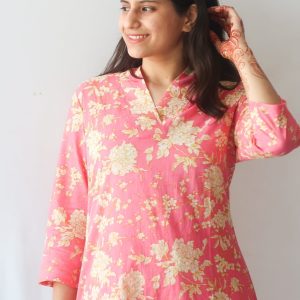 Introducing a touch of feminine charm with our pure cotton kurta pant set. The kurta showcases a classic straight cut silhouette, adorned with a delightful bubblegum pink base complemented by elegant off-white and yellowish floral prints. Its V-neck style and 3/4 sleeves add a graceful flair to your ensemble, perfect for any occasion.