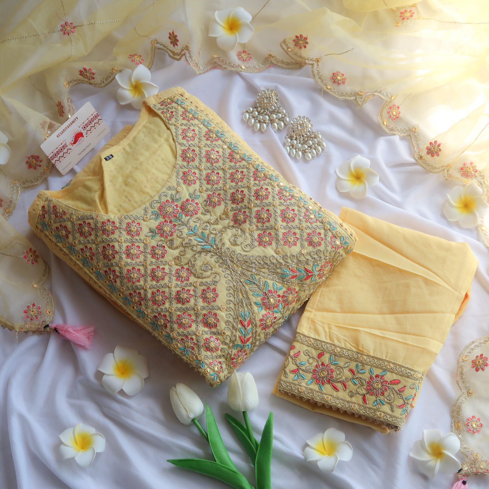 Completing the look are the yellow plain pants, subtly adorned with delicate work on the pants’ end closures. These pants are designed to provide both comfort and style, allowing for ease of movement.